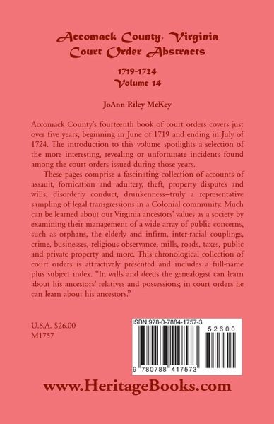 Accomack County's fourteenth book of court orders covers just over five years, beginning in June of 1719 and ending in July of 1724. The introduction to this volume spotlights a selection of the more interesting, revealing or unfortunate incidents found among the court orders issued during those years. These pages comprise a fascinating collection of accounts of assault, fornication and adultery, theft, property disputes and wills, disorderly conduct, drunkenness-truly a representative sampling of legal transgressions in a Colonial community. Much can be learned about our Virginia ancestors' values as a society by examining their management of a wide array of public concerns, such as orphans, the elderly and infirm, inter-racial couplings, crime, businesses, religious observance, mills, roads, taxes, public and private property and more. This chronological collection of court orders is attractively presented and includes a full-name plus subject index. "In wills and deeds the genealogist can learn about his ancestors' relatives and possessions; in court orders he can learn about his ancestors."