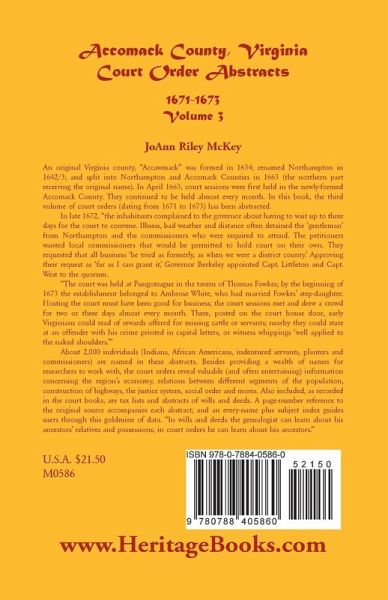 An original Virginia county, "Accawmack" was formed in 1634; renamed Northampton in 1642/3; and split into Northampton and Accomack Counties in 1663 (the northern part receiving the original name). In April 1663, court sessions were first held in the newly-formed Accomack County. They continued to be held almost every month. In this book, the third volume of court orders (dating from 1671 to 1673) has been abstracted. In late 1672, "the inhabitants complained to the governor about having to wait up to three days for the court to convene. Illness, bad weather and distance often detained the 'gentleman' from Northampton and the commissioners who were required to attend. The petitioners wanted local commissioners that would be permitted to hold court on their own. They requested that all business 'be tried as formerly, as when we were a district county.' Approving their request as 'far as I can grant it,' Governor Berkeley appointed Capt. Littleton and Capt. West to the quorum. "The court was held at Pungoteague in the tavern of Thomas Fowkes; by the beginning of 1673 the establishment belonged to Ambrose White, who had married Fowkes' step-daughter. Hosting the court must have been good for business; the court sessions met and drew a crowd for two or three days almost every month. There, posted on the court house door, early Virginians could read of rewards offered for missing cattle or servants; nearby they could stare at an offender with his crime printed in capital letters, or witness whippings 'well applied to the naked shoulders.'" About 2,000 individuals-Indians, African Americans, indentured servants, planters and commissioners-are named in these abstracts. Besides providing a wealth of names for researchers to work with, the court orders reveal valuable-and often entertaining-information concerning the region's economy, relations between different segments of the population, construction of highways, the justice system, social order and mores. Also included, as recorded in the court books, are tax lists and abstracts of wills and deeds. A page-number reference to the original source accompanies each abstract; and an every-name plus subject index guides users through this goldmine of data. "In wills and deeds the genealogist can learn about his ancestors' relatives and possessions; in court orders he can learn about his ancestors."