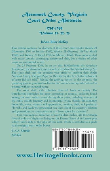 This volume contains the abstracts of three court order books: Volume 21 (November 1765 to January 1767), Volume 22 (February 1767 to March 1768), and Volume 23 (April 1768 to February 1769). These volumes deal with many lawsuits concerning money and debt, but a variety of other issues are confronted as well. On 25 February 1766, in an act that foreshadowed the American Revolution, the Accomack justices took a stand on the detested Stamp Act. The court clerk and the attorneys were afraid to perform their duties "without having Stamped Paper as Directed by the Act of the Parliament of great Brittain (sic)." Joining the growing protest in the colonies, the presiding justices promised to dismiss the cases of attorneys who refused to proceed without stamped paper. The court dealt with colonists from all levels of society. The introduction spotlights the more interesting or unusual incidents found among the court orders issued during those years, including accounts of the court, assault, bastardy and incontinent living, church, the economy, home life, slaves, servants and apprentices, taxation, theft, and profanity. "In wills and deeds the genealogist can learn about his ancestors' relatives and possessions; in court orders he can learn about his ancestors." This chronological collection of court orders reaches into the everyday lives of ordinary Virginians living on the Eastern Shore. A full name plus subject index adds to the value of this work, which is intended as a guide to the original court order books.