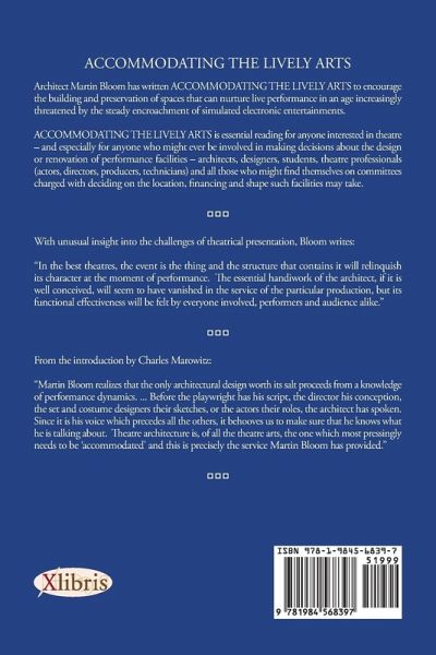 ACCOMMODATING THE LIVELY ARTS, An Architect's View, insightfully analyzes the needs of those who design theatres, work in theatre, or attend theatre. Illustrating his points with many sketches, Bloom shows how, over time, the elements of Focus, Platform and Frame have determined - and still determine - the success of the theatrical performance. Essential reading for anyone involved in making decisions about the design or renovation of performance facilities - architects, designers, students, theatre professionals and all those who decide on the location, financing, and shape such facilities may take.