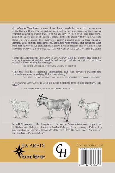 According to Their Kinds presents all vocabulary words that occur 100 times or more in the Hebrew Bible. Pairing pictures with biblical text and arranging the words in thematic categories makes these 470 words easy to memorize. The illustrations consist of the Picture Hebrew Flashcards 3rd edition, along with 50 extra words to round out the sections. This innovative resource assists users in three stages of learning, with English transliterations, simplified verb phrases, and sentences taken from biblical verses. An alphabetized Hebrew-English glossary and an English index make this a convenient reference tool you will want to come back to again and again.