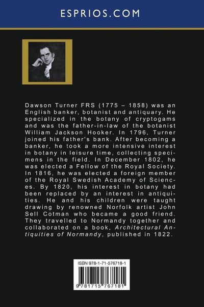 Dawson Turner FRS (1775 - 1858) was an English banker, botanist and antiquary. He specialized in the botany of cryptogams and was the father-in-law of the botanist William Jackson Hooker. In 1796, Turner joined his father's bank. After becoming a banker, he took a more intensive interest in botany in leisure time, collecting specimens in the field. In December 1802, he was elected a Fellow of the Royal Society. In 1816, he was elected a foreign member of the Royal Swedish Academy of Sciences. By 1820, his interest in botany had been replaced by an interest in antiquities. He and his children were taught drawing by renowned Norfolk artist John Sell Cotman who became a good friend. They travelled to Normandy together and collaborated on a book, Architectural Antiquities of Normandy, published in 1822.