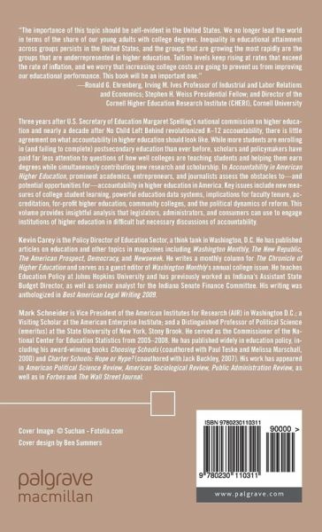 In Accountability in American Higher Education prominent academics, entrepreneurs, and journalists assess the obstacles to, and potential opportunities for, accountability in higher education in America. Providing analysis that can be used to engage institutions of higher education in the difficult but necessary conversation of accountability.