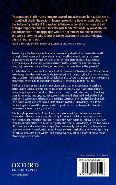 Accounting is the language of business, increasingly standardized across the world through powerful global corporations: a technical skill used to reach the correct, unquestionable answer. Yet, as recent corporate scandals have shown, a whole range of financial professionals (auditors, bankers, analysts, company directors) can collectively fail to question dubious actions. How can this be possible? To understand such failures, this book explores how accountants construct the technical knowledge they deem relevant to decision-making. In doing so, it not only offers a new way to understand deviance and scandals, but also suggests a reappraisal of accounting knowledge which has important implications for everyday commercial life. The book's findings are based on interviews with chartered accountants working in the largest accountancy practices in London. The interviews reveal that although accounting decisions seem clear after they have been made, the process of making them is contested and opaque. Yet accountants nonetheless tend to describe their work as if it were straightforward and technical. Accountants' Truth digs beneath the surface to explore how accountants actually construct knowledge, and draws out the implications of that process with respect to issues such as professionalism, performance, transparency, and ethics. This important book concludes that accountants' technical discourse undermines their ethical reasoning by obscuring the ways in which accounting decisions must be thought through in practice. Accountants with particular ethical perspectives more readily understand and construct particular types of knowledge, so the two issues of knowledge and of ethics are inseparable. Increasingly technical accounting rules can therefore counterproductive. Instead, our best approach to avoiding future scandals is to redefine and reinvigorate professional ethics in the financial world.