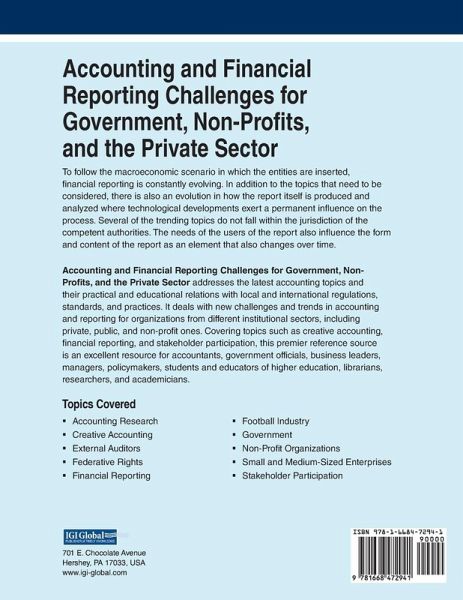 To follow the macroeconomic scenario in which the entities are inserted, financial reporting is constantly evolving. In addition to the topics that need to be considered, there is also an evolution in how the report itself is produced and analyzed where technological developments exert a permanent influence on the process. Several of the trending topics do not fall within the jurisdiction of the competent authorities. The needs of the users of the report also influence the form and content of the report as an element that also changes over time. Accounting and Financial Reporting Challenges for Government, Non-Profits, and the Private Sector addresses the latest accounting topics and their practical and educational relations with local and international regulations, standards, and practices. It deals with new challenges and trends in accounting and reporting for organizations from different institutional sectors, including private, public, and non-profit ones. Covering topics such as creative accounting, financial reporting, and stakeholder participation, this premier reference source is an excellent resource for accountants, government officials, business leaders, managers, policymakers, students and educators of higher education, librarians, researchers, and academicians.