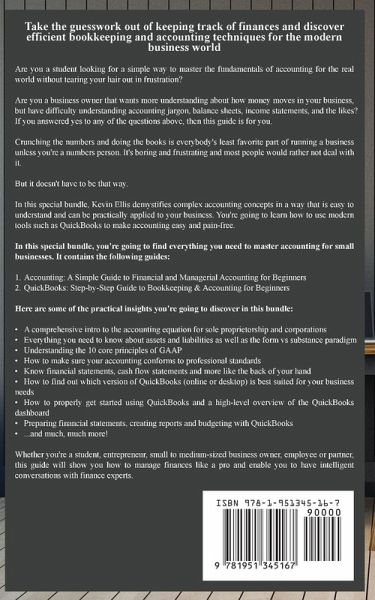 Take the guesswork out of keeping track of finances and discover efficient bookkeeping and accounting techniques for the modern business world Are you a student looking for a simple way to master the fundamentals of accounting for the real world without tearing your hair out in frustration? Are you a business owner that wants more understanding about how money moves in your business, but have difficulty understanding accounting jargon, balance sheets, income statements, and the likes? If you answered yes to any of the questions above, then this guide is for you. Crunching the numbers and doing the books is everybody's least favorite part of running a business unless you're a numbers person. It's boring and frustrating and most people would rather not deal with it. But it doesn't have to be that way. In this special bundle, Kevin Ellis demystifies complex accounting concepts in a way that is easy to understand and can be practically applied to your business. You're going to learn how to use modern tools such as QuickBooks to make accounting easy and pain-free. In this special bundle, you're going to find everything you need to master accounting for small businesses. It contains the following guides: 1. Accounting: A Simple Guide to Financial and Managerial Accounting for Beginners 2. QuickBooks: Step-by-Step Guide to Bookkeeping & Accounting for Beginners Here are some of the practical insights you're going to discover in this bundle: * A comprehensive intro to the accounting equation for sole proprietorship and corporations * Everything you need to know about assets and liabilities as well as the form vs substance paradigm * Understanding the 10 core principles of GAAP * How to make sure your accounting conforms to professional standards * Know financial statements, cash flow statements and more like the back of your hand * How to find out which version of QuickBooks (online or desktop) is best suited for your business needs * How to properly get started using QuickBooks and a high-level overview of the QuickBooks dashboard * Preparing financial statements, creating reports and budgeting with QuickBooks * ...and much, much more! Whether you're a student, entrepreneur, small to medium-sized business owner, employee or partner, this guide will show you how to manage finances like a pro and enable you to have intelligent conversations with finance experts! Scroll up and click the "add to cart" button to buy now!