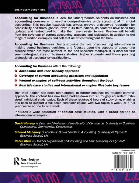 'Accounting for Business' is ideal for undergraduate students on business and accounting courses who need to understand the nuts and bolts of financial accounting. This popular textbook has always enjoyed a deserved reputation for accessibility and thoroughness. Now in its third edition, its contents have been fully updated and restructured to make them even easier to use. Readers will benefit from the coverage of current accounting practices and legislation, in addition to the range of worked examples and self-test activities throughout the book. 'Accounting for Business' clearly explains accounting information's role in making sound business decisions and focuses upon the aspects of accounting practice which are most relevant to the non-specialist manager. It is ideal for first year undergraduates of business studies, higher students and those pursuing professional accountancy qualifications. This third edition has been restructured, to further enhance its 'student centred' approach. The content has now been broken down into 25 roughly equivalent 'bite-sized' individual study topics. Each of these requires 6 hours of study time, enabling this book to support a full scale semester course with two topics a week, or a full year course at one topic a week. Includes a wide selection of topical case studies, with a broad spread of international examples.