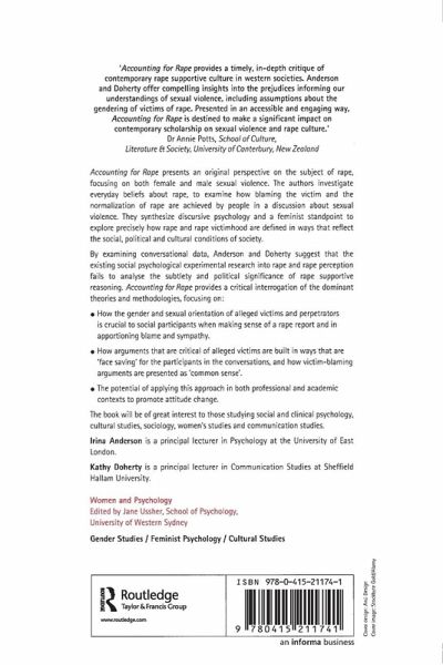 Accounting for Rape presents an original perspective on the subject of rape, focusing on both female and male sexual violence. The authors investigate everyday beliefs about rape, to examine how blaming the victim and the normalization of rape are achieved by people in a discussion about sexual violence. They synthesize discursive psychology and a feminist standpoint to explore precisely how rape and rape victimhood are defined in ways that reflect the social, political and cultural conditions of society. By analysing conversational data, Anderson and Doherty suggest that the existing social psychological experimental research into rape and rape perception fails to analyse the subtlety and political significance of rape supportive reasoning. Accounting for Rape provides a critical interrogation of the dominant theories and methodologies, focusing on: How the gender and sexual orientation of alleged victims and perpetrators is crucial to social participants when making sense of a rape report and in apportioning blame and sympathy How arguments that are critical of alleged victims are built in ways that are 'face saving' for the participants in the conversations, and how victim-blaming arguments are presented as 'common sense'. The potential of applying this approach in both professional and academic contexts to promote attitude change. The book will be of great interest to those studying social and clinical psychology, cultural studies, sociology, women's studies and communication studies.