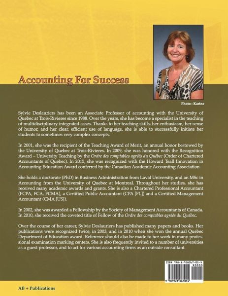 SYLVIE DESLAURIERS Curriculum Vitae complet : www.ABplusPublications.com Sylvie Deslauriers est professeure associée en sciences comptables à l'Université du Québec à Trois-Rivières (UQTR) depuis 1988. Passionnée par l'enseignement, elle croit au potentiel de réussite de chaque personne qu'elle côtoie et se dévoue à la recherche de méthodes d'enseignement adaptées. Grâce à ses talents de pédagogue, son enthousiasme et son humour, elle réussit à transmettre des notions parfois très complexes dans un langage clair et efficace. Elle est détentrice d'un doctorat en administration (PhD) de l'Université Laval, d'une maîtrise en sciences comptables de l'Université du Québec à Montréal et d'un baccalauréat de l'Université de Sherbrooke en administration des affaires. Elle est également membre de l'Ordre des Comptables professionnels agréés du Québec (FCPA auditrice FCA), de l'American Institute of Certified Public Accountants (CPA [FL]) et de l'Association of Accountants and Financial Professionals in Business (CMA [É.-U.]). S'étant illustrée de façon exceptionnelle dans sa profession, Sylvie Deslauriers a obtenu le prestigieux titre de Fellow décerné par l'Ordre des comptables agréés du Québec en 2010 ainsi que le titre convoité de Fellow de la Société des comptables en management du Canada en 2002. Membre du cercle d'excellence du réseau de l'Université du Québec, et détentrice de la prestigieuse Médaille UQTR 2020, Sylvie Deslauriers a reçu plusieurs prix et récompenses, en tant que professeure et en tant qu'auteure de nombreux textes et volumes. Elle a reçu, en 2016, le Prix d'excellence en enseignement L.S. Rosen décerné par l'Association canadienne des professeurs en comptabilité. Cet organisme l'a également honorée à deux reprises, en 2015 et 2016, en lui décernant le Prix Howard Tell sur l'innovation dans l'enseignement de la comptabilité. Outre l'obtention du Prix d'excellence en enseignement universitaire de l'Ordre des comptables agréés du Québec reçu en 2009, ainsi que le Prix institutionnel de reconnaissance en enseignement de l'UQTR, reçu en 2001, les écrits de Sylvie Deslauriers ont été récompensés à deux reprises, en 2003 et en 2010, dans le cadre du Concours annuel des Prix du ministre de l'Éducation.
