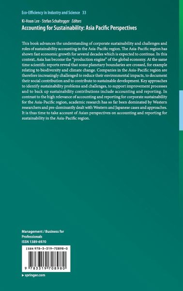 This book advances the understanding of corporate sustainability and challenges and roles of sustainability accounting in the Asia-Pacific region. The Asia-Pacific region has shown fast economic growth for several decades which is expected to continue. In this context, Asia has become the "production engine" of the global economy. At the same time scientific reports reveal that some planetary boundaries are crossed, for example relating to biodiversity and climate change. Companies in the Asia-Pacific region are therefore increasingly challenged to reduce their environmental impacts, to document their social contribution and to contribute to sustainable development. Key approaches to identify sustainability problems and challenges, to support improvement processes and to back up sustainability contributions include accounting and reporting. In contrast to the high relevance of accounting and reporting for corporate sustainability for the Asia-Pacific region, academic researchhas sofar been dominated by Western researchers and pre-dominantly dealt with Western and Japanese cases and approaches. It is thus time to take account of Asian perspectives on accounting and reporting for sustainability in the Asia-Pacific region.