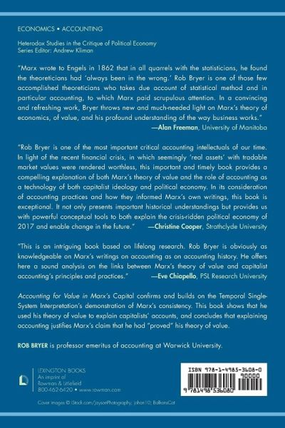 Many scholars discuss Marx's Capital from many perspectives, but Accounting for Value uniquely advances and defends an 'accounting interpretation' of his theory of value, that he used it to explain capitalists' accounts. It confirms and builds on the Temporal Single-System Interpretation's refutation of the charge that Marx's illustration of the 'transformation from values to prices' is inconsistent, and its defense of his 'Law of the Tendential Fall in the Rate of Profit'. It rejects other interpretations by showing that only a 'temporal', 'single-system' interpretation is consistent with Marx's accounting. The book shows that Marx became seriously interested in accounts from the late 1850s during an important period in the development of his critique of political economy, asking Engels for information and explanations. Examining their letters in the context of Marx's evolving work, it argues, supports the hypothesis that discovering he could explain them with his theory of value gave him the breakthrough he needed to decide how to present his work and explains why, in 1862, he decided to change its title to Capital. Marx's explanations of capitalist accounting, it concludes, amount to an 'accounting theory' that explains how individual capitalists and the capital market use what is, for many, the 'invisible hand' of accounting to control the production and distribution of surplus value. Marx claimed his theory of value was a work of 'science', a critique of political economy that would deliver a 'theoretical blow' from which the bourgeoisie would 'never recover'. He failed, critics argue, because his critique depends on hypothetical entities, which we cannot directly observe, such as 'value' and 'abstract labour', 'surplus value', which means his theory is not open to empirical refutation. The book, however, argues that he used his theory of value to explain the 'phenomenal forms' of 'profit', 'rate of profit', etc., by explaining the observable accounting principles and practices capitalists use to calculate and control them, in which, as he said, we can 'glimpse' the determination of value by socially necessary labor time, which experience could have refuted.