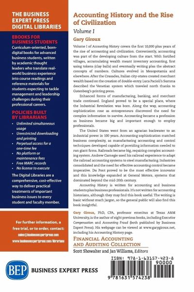 Volume 1 of Accounting History covers the first 10,000 plus years of the rise of accounting and civilization. Conveniently, accounting was part of the developing culture from the start. With fortified villages, accumulating wealth meant inventory accounting, first using tokens (clay balls) and eventually writing plus the abstract concepts of numbers. Cultures evolved in Mesopotamia and elsewhere. After the Crusades, Italian city-states created merchant wealth based on the creation of double-entry. Luca Pacioli's Summa described the Venetian system, which traveled north thanks to Gutenberg's printing press. Enhanced forms of manufacturing, banking, and merchant trade continued. England proved to be a special place, where the Industrial Revolution was born. Along the way, accounting sophistication rose as entrepreneurs discovered the need for complex information to survive. Accounting became a profession as business became big and important enough to employ professionals. The United States went from an agrarian backwater to an industrial power in 100 years. Accounting sophistication matched business complexity, as manufacturing accounting and control techniques developed capable of providing information needed to run giant firms. Railroads became big, requiring complex accounting system. Andrew Carnegie used his railroad experience to adapt the railroad accounting systems to steel manufacturing. Industries consolidated and the need for effective accounting control became imperative. Du Pont proved to be the most effective innovator and this knowledge expanded at General Motors, systems that dominated beyond the mid-20th century. Accounting History is written for accounting and business students plus business professionals. It's not written for accounting historians, although they may find this book useful. The writing is basic without much jargon, so the general public will also find this book insightful.