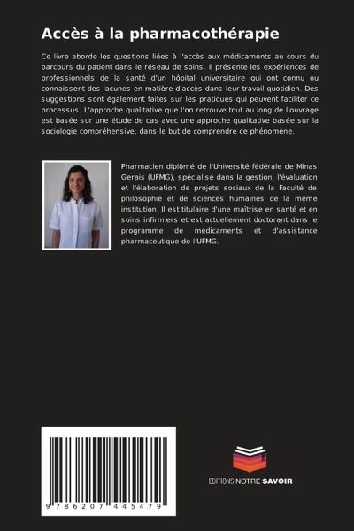 Ce livre aborde les questions liées à l'accès aux médicaments au cours du parcours du patient dans le réseau de soins. Il présente les expériences de professionnels de la santé d'un hôpital universitaire qui ont connu ou connaissent des lacunes en matière d'accès dans leur travail quotidien. Des suggestions sont également faites sur les pratiques qui peuvent faciliter ce processus. L'approche qualitative que l'on retrouve tout au long de l'ouvrage est basée sur une étude de cas avec une approche qualitative basée sur la sociologie compréhensive, dans le but de comprendre ce phénomène.