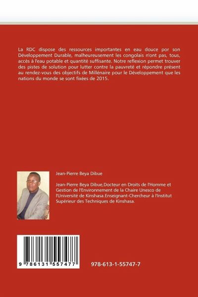 La RDC dispose des ressources importantes en eau douce por son Développement Durable, malheureusement les congolais n'ont pas, tous, accès à l'eau potable et quantité suffisante. Notre reflexion permet trouver des pistes de solution pour lutter contre la pauvreté et répondre présent au rendez-vous des objectifs de Millénaire pour le Développement que les nations du monde se sont fixées de 2015.