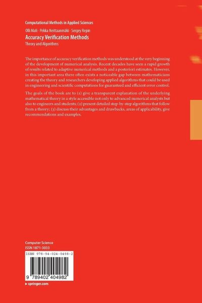 1 Errors Arising In Computer Simulation Methods.- 1.1 General scheme.- 1.2 Errors of mathematical models.- 1.3 Approximation errors.- 1.4 Numerical errors.- 2 Error Indicators.- 2.1 Error indicators and adaptive numerical methods.- 2.1.1 Error indicators for FEM solutions.- 2.1.2 Accuracy of error indicators.- 2.2 Error indicators for the energy norm.- 2.2.1 Error indicators based on interpolation estimates.- 2.2.2 Error indicators based on approximation of the error functional.- 2.2.3 Error indicators of the Runge type.- 2.3 Error indicators for goal-oriented quantities.- 2.3.1 Error indicators relying on the superconvergence of averaged fluxes in the primal and adjoint problems.- 2.3.2 Error indicators using the superconvergence of approximations in the primal problem.- 2.3.3 Error indicators based on partial equilibration of fluxes in the original problem.- 3 Guaranteed Error Bounds I.- 3.1 Ordinary differential equations.- 3.1.1 Derivation of guaranteed error bounds.- 3.1.2 Computation of error bounds.- 3.2 Partial differential equations.- 3.2.1 Maximal deviation from the exact solution.- 3.2.2 Minimal deviation from the exact solution.- 3.2.3 Particular cases.- 3.2.4 Problems with mixed boundary conditions.- 3.2.5 Estimates of global constants entering the majorant.- 3.2.6 Error majorants based on Poincar´e inequalities.- 3.2.7 Estimates with partially equilibrated fluxes.- 3.3 Error control algorithms.- 3.3.1 Global minimization of the majorant.- 3.3.2 Getting an error bound by local procedures.- 3.4 Indicators based on error majorants.- 3.5 Applications to adaptive methods.- 3.6 Combined (primal-dual) error norms and the majorant.- 4 Guaranteed Error Bounds II.- 4.1 Linear elasticity.- 4.1.1 Introduction.- 4.1.2 Euler-Bernoulli beam.- 4.1.3 The Kirchhoff-Love arch model.- 4.1.4 The Kirchhoff-Love plate.- 4.1.5 The Reissner-Mindlin plate.- 4.1.6 3D linear elasticity.- 4.1.7 The plane stress model.- 4.1.8 The plane strain model.- 4.2 TheStokes Problem.- 4.2.1 Divergence-free approximations.- 4.2.2 Approximations with nonzero divergence.- 4.2.3 Stokes problem in rotating system.- 4.3 A simple Maxwell type problem.- 4.3.1 Estimates of deviations from exact solutions.- 4.3.2 Numerical examples.- 4.4 Generalizations.- 4.4.1 Error majorant.- 4.4.2 Error minorant.- 5 Errors Generated By Uncertain Data.- 5.1 Mathematical models with incompletely known data.- 5.2 The accuracy limit.- 5.3 Estimates of the worst and best case scenario errors.- 5.4 Two-sided bounds of the radius of the solution set.- 5.5 Computable estimates of the radius of the solution set.- 5.5.1 Using the majorant.- 5.5.2 Using a reference solution.- 5.5.3 An advanced lower bound.- 5.6 Multiple sources of indeterminacy.- 5.6.1 Incompletely known right-hand side.- 5.6.2 The reaction diffusion problem.- 5.7 Error indication and indeterminate data.- 5.8 Linear elasticity with incompletely known Poisson ratio.- 5.8.1 Sensitivity of the energy functional.- 5.8.2 Example: axisymmetric model.- 6 Overview Of Other Results And Open Problems.- 6.1 Error estimates for approximations violating conformity.- 6.2 Linear elliptic equations.- 6.3 Time-dependent problems.- 6.4 Optimal control and inverse problems.- 6.5 Nonlinear boundary value problems.- 6.5.1 Variational inequalities.- 6.5.2 Elastoplasticity.- 6.5.3 Problems with power growth energy functionals.- 6.6 Modeling errors.- 6.7 Error bounds for iteration methods.- 6.7.1 General iteration algorithm.- 6.7.2 A priori estimates of errors.- 6.7.3 A posteriori estimates of errors.- 6.7.4 Advanced forms of error bounds.- 6.7.5 Systems of linear simultaneous equations.- 6.7.6 Ordinary differential equations.- 6.8 Roundoff errors.- 6.9 Open problems.- A Mathematical Background.- A.1 Vectors and tensors .- A.2 Spaces of functions.- A.2.1 Lebesgue and Sobolev spaces.- A.2.2 Boundary traces.- A.2.3 Linear functionals.- A.3 Inequalities.- A.3.1 The Hölder inequality.- A.3.2 The Poincaré and Friedrichsinequalities.- A.3.3 Korn's inequality.- A.3.4 LBB inequality.- A.4 Convex functionals.- B Boundary Value Problems.- B.1 Generalized solutions of boundary value problems.- B.2 Variational statements of elliptic boundary value problems.- B.3 Saddle point statements of elliptic boundary value problems.- B.3.1 Introduction to the theory of saddle points.- B.3.2 Saddle point statements of linear elliptic problems.- B.3.3 Saddle point statements of nonlinear variational problems.- B.4 Numerical methods.- B.4.1 Finite difference methods.- B.4.2 Variational difference methods.- B.4.3 Petrov-Galerkin methods.- B.4.4 Mixed finite element methods.- B.4.5 Trefftz methods.- B.4.6 Finite volume methods.- B.4.7 Discontinuous Galerkin methods.- B.4.8 Fictitious domain methods.- C A Priori Verification Of Accuracy.- C.1 Projection error estimate.- C.2 Interpolation theory in Sobolev spaces.- C.3 A priori convergence rate estimates.- C.4 A priori error estimates for mixed FEM.- References.- Notation.- Index.