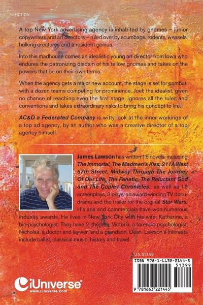 A top New York advertising agency is inhabited by gnomes - junior copywriters and art directors - ruled over by scumbags, rodents, weasels, hulking creatures and a resident genius. Into this madhouse comes an idealistic young art director from Iowa who endures the patronizing disdain of his fellow gnomes and takes on the powers that be on their own terms. When the agency gets a major new account, the stage is set for combat, with a dozen teams competing for prominence. Joel, the idealist, given no chance of reaching even the first stage, ignores all the rules and conventions and takes extraordinary risks to bring his concept to life. AC&D a Federated Company is witty look at the inner workings of a top ad agency, by an author who was a creative director of a top agency himself.