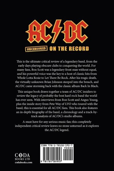 This is the ultimate critical review of a legendary band, from the early days playing obscure clubs to conquering the world. For many fans, Bon Scott was a legendary front man without equal, and his powerful voice was the key to a host of classic hits from Whole Lotta Rosie to Let There Be Rock. After his tragic death, the virtually unknown Brian Johnson steeped into the breach, and AC/DC came storming back with the classic album Back In Black. This unique book draws together a team of AC/DC insiders to review the legacy of probably the best hard rock band the world has ever seen. With interviews from Bon Scott and Angus Young, plus the inside story from Pete Way of UFO who toured with the band, this is essential for all AC/DC fans. This book also features an in-depth biography of the band, a chronology and a track-by-track analysis of AC/DC's studio albums. A must have for any serious music fan; this completely independent critical review leaves no stone unturned as it explores the AC/DC legend.