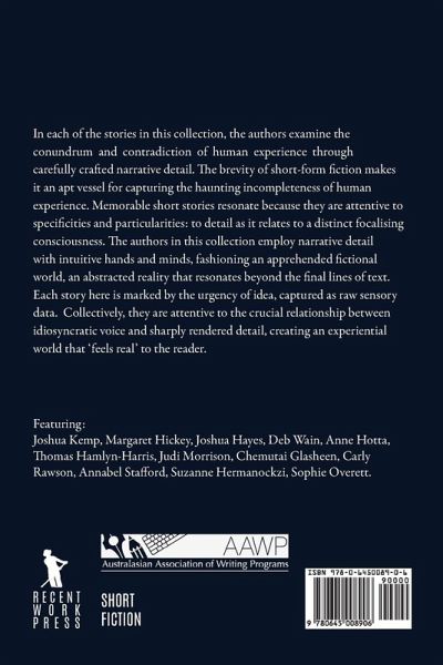 In each of the stories in this collection, the authors examine the conundrum and contradiction of human experience through carefully crafted narrative detail. The brevity of short-form fiction makes it an apt vessel for capturing the haunting incompleteness of human experience. Memorable short stories resonate because they are attentive to specificities and particularities: to detail as it relates to a distinct focalising consciousness. The authors in this collection employ narrative detail with intuitive hands and minds, fashioning an apprehended fictional world, an abstracted reality that resonates beyond the final lines of text. Each story here is marked by the urgency of idea, captured as raw sensory data. Collectively, they are attentive to the crucial relationship between idiosyncratic voice and sharply rendered detail, creating an experiential world that 'feels real' to the reader. Featuring: Joshua Kemp, Margaret Hickey, Joshua Hayes, Deb Wain, Anne Hotta, Thomas Hamlyn-Harris, Judi Morrison, Chemutai Glasheen, Annabel Stafford, Suzanne Hermanockzi, Sophie Overett. This project was generously supported by the Australasian Association of Writing Programs (AAWP), the peak academic body representing the discipline of Creative Writing in Australasia.