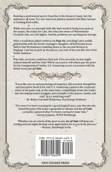 Running a professional sports franchise is the dream of many, but the nightmare of some. For one American playboy named Cain Shaw, fantasy is clashing with reality. While everyone occasionally feels like their world is being torn apart at the seams, the stakes for Cain, the reluctant owner of Westminster Football Club, are a bit higher. And his problems are anything but average. After a scandalous photo surfaces on Page Six, revealing Cain's sordid relationship with the former manager's daughter, all hell breaks loose. Add to that Westminster tumbling down to the second division in England. Cain has to pick up the pieces, not only of his own life, but of the family business. If he fails, everyone could lose their job. If he succeeds, he just might redeem himself and the Club. Will he succeed or will others pay the price for his transgressions? Author Sean Armstrong scores a screamer with his debut novel, Ace of Clubs.