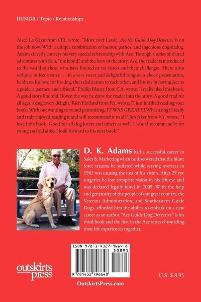 This story chronicles the first year of a veteran with his guide dog. Guide Dogs for the visually impaired are truly remarkable animals and the bond that develops between these two can be extraordinary. Total trust and unconditional love are the corner stones of their relationship. This book follows that development in a light hearted, tongue-in-cheek manner from the dog's perspective. Alyce La Gasse from OR wrote; Move over Lassie, Ace the Guide Dog Detective is on the job now. With a unique combination of humor, pathos, and ingenious dog-dialog, Adams cleverly conveys his very special relationship with Ace. Through a series of shared adventures with Ken, 'the blond', and the hero of the story, Ace, the reader is introduced to the world of those who have limited or no vision and their challenges. There is no self-pity in Ken's story . . . in a very sweet and delightful tongue-in-cheek presentation; he shares his love for his dog, their dedication to each other, and his joy in having Ace as a guide, a partner, and a friend. Phillip Blaney from CA. wrote; I really liked this book. A good story line and I loved the way he drew the reader into the story. A good read for all ages, a dog lovers delight. Rich Holland from PA. wrote; I just finished reading your book. Without wanting to sound patronizing, IT WAS GREAT!!! What a dog! I really and truly enjoyed reading it and will recommend it to all. Jim Aker from VA. wrote; I loved the book. Good for all dog lovers and others as well. I would recommend it for young and old alike. I look forward to his next book.