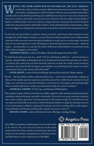 While the term acedia may be unfamiliar, the vice, usually translated as sloth, is all too common. Sloth is not mere laziness, however, but a disgust with reality, a loathing of our call to be friends with God, and a spiteful hatred of place and life itself. As described by Josef Pieper, the slothful person does not "want to be as God wants him to be, and that ultimately means he does not wish to be what he really, fundamentally is." Sloth is a hellish despair. Our own culture is deeply infected, choosing a destructive freedom rather than the good work for which God created us. Acedia and Its Discontents resists despair, calling us to reconfigure our imaginations and practices in deep love of the life and work given by God. By feasting, keeping sabbath, and working well, we learn to see the world as enchanting, beautiful, and good--just as God sees it. "In the arid wasteland that is academic writing, amid the wider desert that is modern secular thought, R. J. Snell's book on acedia is an oasis of flowers and fruit and fresh water. Professor Snell reminds us that man must never be made subordinate to work, nor even to the empty 'vacations' that are but interruptions in work. Like his great predecessors Josef Pieper, Jacques Maritain, Max Picard, Romano Guardini, and Pope John Paul II, he diagnoses the besetting disease of our time--spiritual torpor--and prescribes as a remedy the joyful celebration of the Sabbath. A stupendous book, filled with the happiness of wonder."--ANTHONY ESOLEN, author of Ten Ways to Destroy the Imagination of Your Child "A whole book about just one vice, 'sloth'? Ah, but this book is different-and devastating. It exposes a deeply hidden and deeply destructive fundamental attitude that pervades our culture, an attitude that comes not just from the flesh (laziness) or from the world (world-weariness, cynicism), but from the Devil: disgust and rebellion toward Being itself, natural as well as supernatural. This is the 'noonday devil' that great saints have labelled 'sloth.' Know your enemy. Read this book!"--PETER KREEFT, author of Practical Theology: Spiritual Direction from St. Thomas Aquinas "Acedia--the sin of sloth, so often confused with laziness--is the most overlooked but widespread illness of the modern age; the emptiness under the mask of the world's frantic activity. R.J. Snell helps us see why this is so and what Christians can do about it with elegant, penetrating insight. This is a terrific book about a badly misunderstood 'deadly sin' and its antidotes."--CHARLES J. CHAPUT, O.F.M. Cap., Archbishop of Philadelphia "Our modern Empire of Desire manufactures endless appetite while simultaneously denying that anything is objectively good, beautiful, or desirable. The result is not great yearning or passion, but acedia or sloth, a pervasive 'noonday demon' which prowls about our culture like a roaring lion, seeking someone to devour. In this learned study, R.J. Snell draws on the vast spiritual and intellectual resources of the Christian tradition to diagnose the deep structure of our contemporary nihilism, exposing this demon and its far-reaching effects with elegance and profundity and thereby providing the weapons necessary to slay it. This is a timely and important book."--MICHAEL HANBY, author of No God, No Science: Theology, Cosmology, Biology R. J. SNELL is professor of philosophy at Eastern University in St. Davids, PA, and executive director of the Agora Institute for Civic Virtue and the Common Good. His recent books include Authentic Cosmopolitanism (with Steve Cone) and The Perspective of Love: Natural Law in a New Mode. He and his wife have four young children.