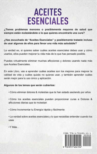 Descubre los Secretos de los Aceites Esenciales... ¿Tienes problemas menores o posiblemente mayores de salud que siempre están molestándote o lo que quieres encontrarle una cura? ¿Has escuchado de "Aceites Esenciales" y posiblemente trataste incluso de usar algunos de ellos para llevar una vida más saludable? La verdad es, si quieres saber cuáles aceites esenciales debes usar y cómo usarlos, ellos pueden mejorar tu vida más de lo que has pensado posible. Puedes virtualmente eliminar muchas aflicciones y dolores usando nada más que Aceites Esenciales. En este Libro, vas a aprender cuáles aceites son los mejores para mejorar la calidad de vida y cuáles quizás no quieras usar, y también aprender cuáles serán mejor para tu uso único y aplicación. Algunos de los temas que serán cubiertos: * Cómo eliminar dolores & molestias que te han estado asolando por años * Cómo los aceites esenciales pueden proporcionar curas a Dolores & aflicciones diarias que te molestan * Cómo Incrementar tu Energía rápida y fácilmente * La verdad sobre aceites esenciales y lo que necesitas entender cuando los usas * Y Más... No esperes otro momento para disfrutar de esta información – Obtén tu copia de Aceites Esenciales ahora mismo!