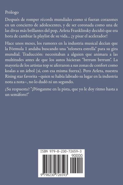 Prólogo Después de romper récords mundiales como si fueran corazones en un concierto de adolescentes, y de ser coronada como una de las divas más brillantes del pop, Arleta Franklinsky decidió que era hora de cambiar la playlist de su vida... ¡y pisar el acelerador! Hace unos meses, los rumores en la industria musical decían que la Fórmula 1 andaba buscando una "telonera estrella" para su gira mundial. Traducción: necesitaban a alguien que animara a las multitudes antes de que los autos hicieran "brrrum brrrum". La mayoría de los artistas top se aferraron a sus zonas de confort como koalas a un árbol (sí, con esa misma fuerza). Pero Arleta, nuestra Rising star favorita -quien se había labrado su lugar en la industria nota a nota-, no lo dudó ni un segundo. ¿Su respuesta? "¡Pónganme en la pista, que yo le doy ritmo hasta a un semáforo!"