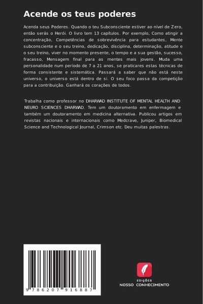 Acenda seus Poderes. Quando o teu Subconsciente estiver ao nível de Zero, então serás o Herói. O livro tem 13 capítulos. Por exemplo, Como atingir a concentração, Competências de sobrevivência para estudantes, Mente subconsciente e o seu treino, dedicação, disciplina, determinação, atitude e o seu treino, viver no momento presente, o tempo e a sua gestão, sucesso, fracasso, Mensagem final para as mentes mais jovens. Muda uma personalidade num período de 7 a 21 anos, se praticares estas técnicas de forma consistente e sistemática. Passará a saber que não está neste universo, o universo está dentro de si. O seu foco passa da competição para a contribuição. Ganhará os corações de todos.