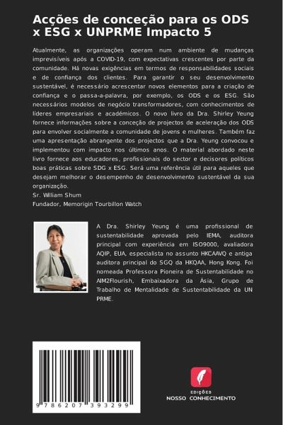 Atualmente, as organizações operam num ambiente de mudanças imprevisíveis após a COVID-19, com expectativas crescentes por parte da comunidade. Há novas exigências em termos de responsabilidades sociais e de confiança dos clientes. Para garantir o seu desenvolvimento sustentável, é necessário acrescentar novos elementos para a criação de confiança e o passa-a-palavra, por exemplo, os ODS e os ESG. São necessários modelos de negócio transformadores, com conhecimentos de líderes empresariais e académicos. O novo livro da Dra. Shirley Yeung fornece informações sobre a conceção de projectos de aceleração dos ODS para envolver socialmente a comunidade de jovens e mulheres. Também faz uma apresentação abrangente dos projectos que a Dra. Yeung convocou e implementou com impacto nos últimos anos. O material abordado neste livro fornece aos educadores, profissionais do sector e decisores políticos boas práticas sobre SDG x ESG. Será uma referência útil para aqueles que desejam melhorar o desempenho de desenvolvimento sustentável da sua organização.Sr. William ShumFundador, Memorigin Tourbillon Watch