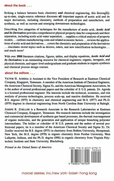 Striking a balance between basic chemistry and chemical engineering, this up-to-date reference discusses important aspects of acetic acid and its major derivatives, including chemistry, methods of preparation and manufacture, and synthesis, as well as current and emerging downstream technologies.;The book provides comprehensive physical property data for compounds and their separation, including acetic acid-water separation. Describing five categories of techniques for the manufacture of acetic acid, it: examines thermophysical properties and aqueous solutions, with detailed explanations of mathematical models and correlations; supplies a critical analysis of property; outlines manufacturing costs and related economic factors; reviews the applications of acetic acid and derivatives; covers the chemistry and preparation of the derivatives; elucidates recent topics such as deicers, esters and new esterification technologies.