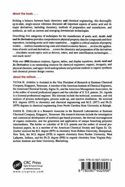 Striking a balance between basic chemistry and chemical engineering, this up-to-date reference discusses important aspects of acetic acid and its major derivatives, including chemistry, methods of preparation and manufacture, and synthesis, as well as current and emerging downstream technologies.;The book provides comprehensive physical property data for compounds and their separation, including acetic acid-water separation. Describing five categories of techniques for the manufacture of acetic acid, it: examines thermophysical properties and aqueous solutions, with detailed explanations of mathematical models and correlations; supplies a critical analysis of property; outlines manufacturing costs and related economic factors; reviews the applications of acetic acid and derivatives; covers the chemistry and preparation of the derivatives; elucidates recent topics such as deicers, esters and new esterification technologies.