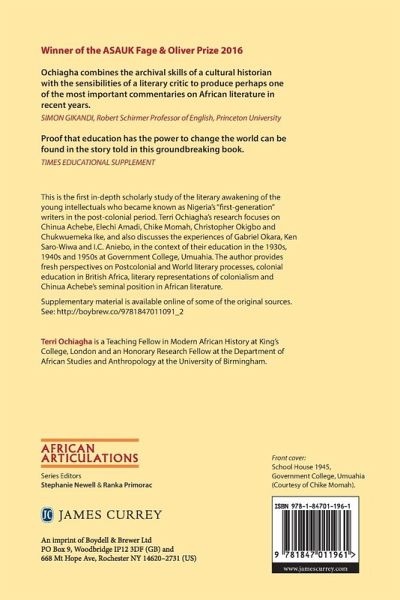 WINNER OF THE ASAUK FAGE & OLIVER PRIZE 2016 The author meticulously contextualises the experiences of Achebe and his peers as students at Government College Umuahia and argues for a re-assessment of this influential group of Nigerian writers in relation to the literary culture fostered by the school and its tutors.