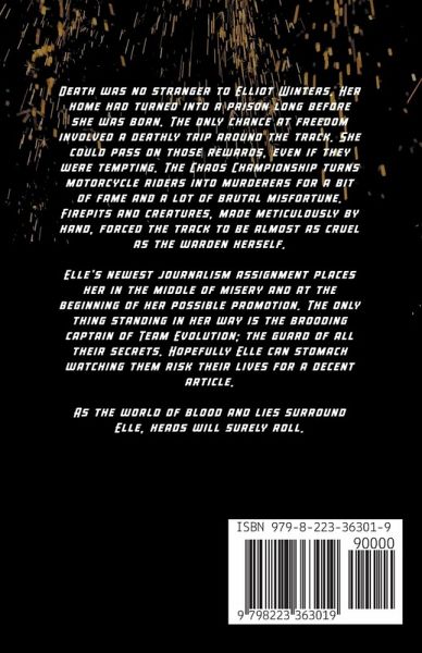 Death was no stranger to Elliot Winters. Her home had turned into a prison long before she was born. The only chance at freedom involved a deathly trip around the track. She could pass on those rewards, even if they were tempting. The Chaos Championship turns motorcycle riders into murderers for a bit of fame and a lot of brutal misfortune. Firepits and creatures, made meticulously by hand, forced the track to be almost as cruel as the warden herself. Elle's newest journalism assignment places her in the middle of misery and at the beginning of her possible promotion. The only thing standing in her way is the brooding captain of Team Evolution; the guard of all their secrets. Hopefully Elle can stomach watching them risk their lives for a decent article. As the world of blood and lies surround Elle, heads will surely roll.