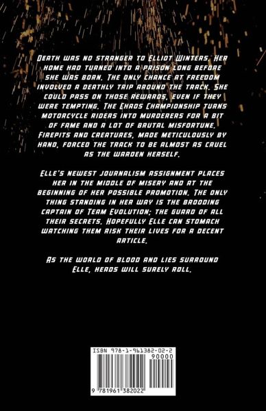 Death was no stranger to Elliot Winters. Her home had turned into a prison long before she was born. The only chance at freedom involved a deathly trip around the track. She could pass on those rewards, even if they were tempting. The Chaos Championship turns motorcycle riders into murderers for a bit of fame and a lot of brutal misfortune. Firepits and creatures, made meticulously by hand, forced the track to be almost as cruel as the warden herself. Elle's newest journalism assignment places her in the middle of misery and at the beginning of her possible promotion. The only thing standing in her way is the brooding captain of Team Evolution; the guard of all their secrets. Hopefully Elle can stomach watching them risk their lives for a decent article. As the world of blood and lies surround Elle, heads will surely roll.