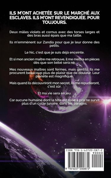 Ils m'ont achetée sur le marché aux esclaves. Ils m'ont revendiquée. Pour toujours. Deux mâles violets et cornus avec des torses larges et des bras aussi épais que ma taille. Ils m'emmènent sur Zandia pour que je leur donne des petits. Le hic, c'est que je suis déjà enceinte. Et si mon ancien maître me retrouve, il me mettra en pièces dès que son bébé sera né. Mes nouveaux maîtres sont fermes, mais gentils. Ils me procurent beaucoup plus de plaisir que de douleur. Leur planète est magnifique. Mais quand ils découvriront mon secret, ils me répudieront, c'est sûr. Et ma vie sera en jeu. Car aucune humaine dont la tête est mise à prix ne survit plus d'un cycle lunaire, dans les parages.