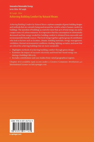 Achieving Building Comfort by Natural Means explores examples of green building designs and methods that are currently being used around the world to achieve human comfort in buildings. The operation of buildings accounts for more than 40% of total energy use and is a major source of carbon emissions. It is imperative that this consumption be substantially decreased and that energy needed for building comfort is obtained from renewable and environmentally friendly sources. This book brings together a global group of contributors who look at factors such as location, climate, building materials, energy management, ventilation, thermal environmental conditions, shading, lighting, acoustics, and more that are critical for achieving buildings that are more sustainable.