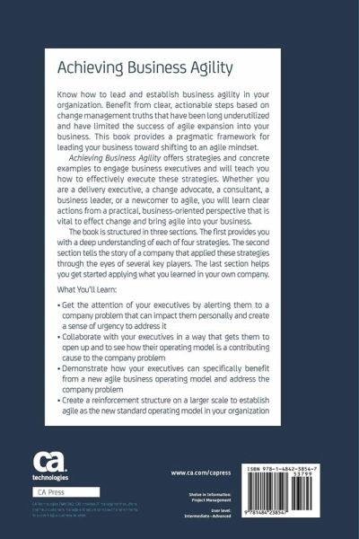 Achieving Business Agility offers strategies and concrete examples to engage business executives and will teach you how to effectively execute these strategies. Whether you are a delivery executive, a change advocate, a consultant, a business leader, or a newcomer to agile, you will learn clear actions from a practical, business-oriented perspective that is vital to effect change and bring agile into your business.