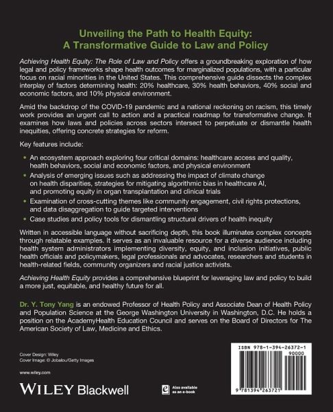 Unveiling the Path to Health Equity: A Transformative Guide to Law and Policy Achieving Health Equity: The Role of Law and Policy offers a groundbreaking exploration of how legal and policy frameworks shape health outcomes for marginalized populations, with a particular focus on racial minorities in the United States. This comprehensive guide dissects the complex interplay of factors determining health: 20% healthcare, 30% health behaviors, 40% social and economic factors, and 10% physical environment. Amid the backdrop of the COVID-19 pandemic and a national reckoning on racism, this timely work provides an urgent call to action and a practical roadmap for transformative change. It examines how laws and policies across sectors intersect to perpetuate or dismantle health inequities, offering concrete strategies for reform. Key features include: * An ecosystem approach exploring four critical domains: healthcare access and quality, health behaviors, social and economic factors, and physical environment * Analysis of emerging issues such as addressing the impact of climate change on health disparities, strategies for mitigating algorithmic bias in healthcare AI, and promoting equity in organ transplantation and clinical trials * Examination of cross-cutting themes like community engagement, civil rights protections, and data disaggregation to guide targeted interventions * Case studies and policy tools for dismantling structural drivers of health inequity Written in accessible language without sacrificing depth, this book illuminates complex concepts through relatable examples. It serves as an invaluable resource for a diverse audience including health system administrators implementing diversity, equity, and inclusion initiatives, public health officials and policymakers, legal professionals and advocates, researchers and students in health-related fields, community organizers and racial justice activists. Achieving Health Equity provides a comprehensive blueprint for leveraging law and policy to build a more just, equitable, and healthy future for all.