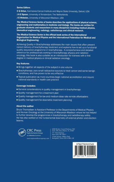 Achieving Quality in Brachytherapy addresses the main issues that often prevent correct delivery of brachytherapy treatment. The book explains how to set up a functional quality assurance program in brachytherapy and covers all the steps needed to undertake particular treatment plans, from the initial planning required to the detailed specification. It highlights the importance of planning as a means of controlling and dealing with errors during the treatment process and advises on what to check and how to check during treatment to ensure effective quality assurance. This comprehensive reference is ideal for professionals working in brachytherapy, physics, and radiation oncology, and serves as an introduction for trainees with an undergraduate degree in medical physics or clinical radiation oncology.