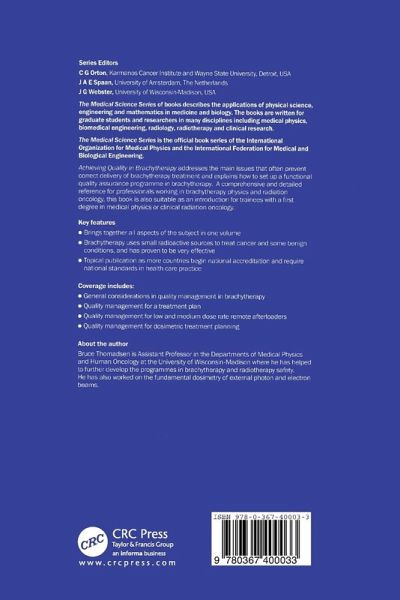Achieving Quality in Brachytherapy addresses the main issues that often prevent correct delivery of brachytherapy treatment. The book explains how to set up a functional quality assurance program in brachytherapy and covers all the steps needed to undertake particular treatment plans, from the initial planning required to the detailed specification. It highlights the importance of planning as a means of controlling and dealing with errors during the treatment process and advises on what to check and how to check during treatment to ensure effective quality assurance.