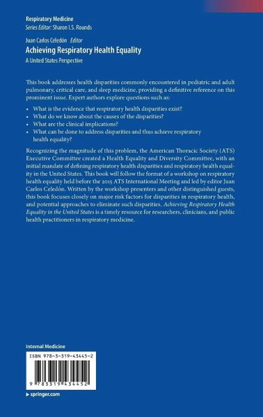 Including comprehensive coverage of health disparities commonly encountered in pediatric and adult pulmonary, critical care, and sleep medicine, Achieving Respiratory Health Equality in the United States provides a definitive reference on this prominent issue. Expert authors explore questions such as: _ What is the evidence that respiratory health disparities exist? _ What do we know about the causes of the disparities? _ What are the clinical implications? _ What can be done to address the particular disparities and thus achieve health equality? Recognizing the magnitude of this problem, the American Thoracic Society (ATS) Executive Committee created a Health Equality Sub-Committee, with an initial mandate of defining respiratory health disparities and respiratory health equality in the United States. This book will follow the format of a workshop on respiratory health equality held before the 2015 ATS International Meeting and led by editor Juan Carlos Celedón. Written by the workshop presenters, this book focuses closely on major risk factors for health, specific respiratory diseases for which health disparities are known to occur, and potential approaches to eliminate such disparities. Achieving Respiratory Health Equality in the United States is a timely resource for researchers, clinicians, and public health practitioners in respiratory medicine.