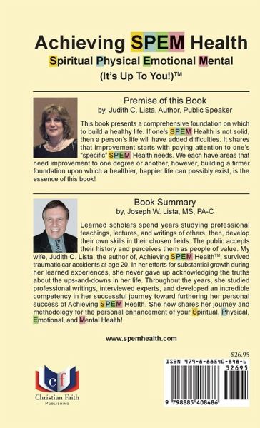 Premise of this Book This book presents a comprehensive foundation on which to build a healthy life. If one's SPEM Health is not solid, then a person's life will have added difficulties. It shares that improvement starts with paying attention to one's "specific" SPEM Health needs. We each have areas that need improvement to one degree or another, however, building a firmer foundation upon which a healthier, happier life can possibly exist, is the essence of this book! by, Judith C. Lista, Author/Public Speaker Book Summary Learned scholars spend years studying professional teachings, lectures, and writings of others, then, develop their own skills in their chosen fields. The public accepts their history and perceives them as people of value. My wife, Judith C. Lista, the author of, Achieving SPEM HealthTM, survived traumatic car accidents at age 20. In her efforts for substantial growth during her learned experiences, she never gave up acknowledging the truths about the ups-and-downs in her life. Throughout the years, she studied professional writings, interviewed experts, and developed an incredible competency in her successful journey toward furthering her personal success of, Achieving SPEM Health. She now shares her journey and methodology for the personal enhancement of your Spiritual, Physical, Emotional, and Mental Health!by, Joseph W. Lista, M.S., PA-C www.spemhealth.com