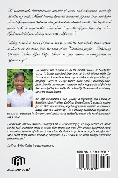 A motivational, heartwarming treasure of stories and experiences succinctly describes my work. Nestled between the covers are words of power, truth and hope; all real life experiences that serve as a guide to those who seek success. The key strand woven in the messages within echoes that, "regardless of your beginning, when God is included your destiny is one with a difference". Many stories have been told from across the world, this book tells the stories of those so close to us; the stories from the heart of our Caribbean people. "Achieving Success: Never Give Up! Serves to give readers encouragement in different ways!