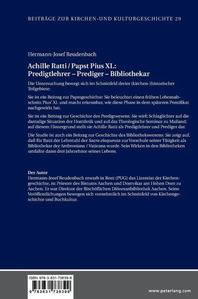 Die Untersuchung bewegt sich im Schnittfeld dreier (kirchen-)historischer Teilgebiete. Sie ist ein Beitrag zur Papstgeschichte: Sie beleuchtet einen frühen Lebensabschnitt Pius' XI. und macht erkennbar, wie diese Phase in dem späteren Pontifikat nachgewirkt hat. Sie ist ein Beitrag zur Geschichte des Predigtwesens: Sie wirft Schlaglichter auf die damalige Situation der Homiletik und auf das Theologische Seminar zu Mailand; auf diesem Hintergrund stellt sie Achille Ratti als Predigtlehrer und Prediger dar. Die Studie ist auch ein Beitrag zur Geschichte des Bibliothekswesens: Sie zeigt auf, daß für Ratti der Lehrstuhl der «Sacra eloquenza» zur Vorschule seiner Tätigkeit als Bibliothekar der Ambrosiana / Vaticana wurde. Sein Wirken in den Bibliotheken umfaßte dann drei Jahrzehnte seines Lebens.
