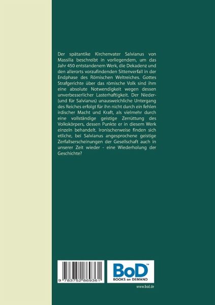 Der spätantike Kirchenvater Salvianus von Massilia beschreibt im vorliegenden, um das Jahr 450 entstandenen, Werk die Dekadenz und den allerorts vorzufindenden Sittenverfall in der Endphase des Römischen Weltreiches. In seinen Augen verdient das römische Volk wegen dessen unverbesserlicher Lasterhaftigkeit, von Gott bestraft zu werden. Der Nieder- (und für Salvianus) unausweichliche Untergang des Römischen Reiches erfolgt für ihn nicht durch das Fehlen irdischer Macht und Kraft, als vielmehr durch eine vollständige geistige Zerrüttung des Staates - ein nach außen prächtig und golden erscheinendes Gebäude, das innen jedoch ausgebrannt und zur leblosen Ruine verkommen ist - welche Punkte er in diesem Werk einzeln abhandelt.