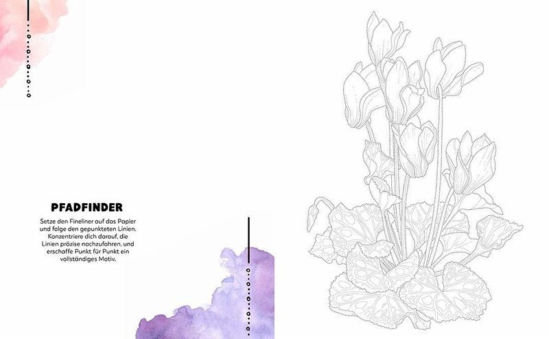 Pfadfinder: Folge den gepunkteten Linien und vervollständige das Motiv.Musterglück: Gestalte die Ausmalmotive mit deinen eigenen kreativen Mustern.Leichte Linien: Experimentiere mit verschiedenen Linien und erschaffe neue Formen.Rückwärts ausmalen: Die Farbe ist bereits da - du ergänzt nur die Umrisse.Letteringliebe: Entdecke einen schönen Spruch und setze ihn perfekt in Szene.One Line: Lerne Schritt für Schritt, eine elegante Illustration zu zeichnen - ohne den Stift abzusetzen.