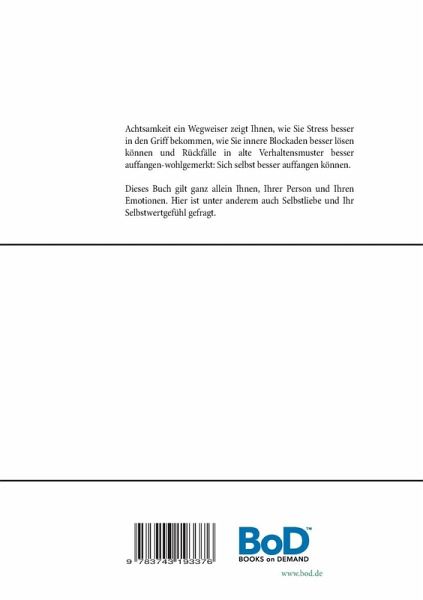Achtsamkeit ein Wegweiser zeigt Ihnen, wie Sie Stress besser in den Griff bekommen, wie Sie innere Blockaden besser lösen können und Rückfälle in alte Verhaltensmuster besser auffangen - wohlgemerkt: Sich selbst besser auffangen können.Dieses Buch gilt ganz allein Ihnen, Ihrer Person und Ihren Emotionen. Hier ist unter anderem auch Selbstliebe und Ihr Selbstwertgefühl gefragt. Denn wer sich selbst nicht annehmen kann, wird schwerlich die Achtsamkeit für sich in Erwägung ziehen. Sie kennen es doch sicherlich auch: Dieser tägliche Stress raubt uns unsere letzten Energien, saugt uns teilweise förmlich aus. Unser Körper reagiert: Kopfschmerzen, Gliederschmerzen, Ängste und vermehrte Sorgen sind die Folge.Kommen wir dann nach Hause warten vielleicht unbezahlte Rechnungen auf uns oder anderweitige Probleme. Hieraus erfolgen schlaflose Nächte. Und wir, wir sind plötzlich im schönsten Gedanken Karussell gefangen.Reagieren wir jetzt nicht - reagieren wir nie mehr. Dann halten wir an unseren Gewohnheiten fest. Achtsamkeit durchbricht diesen Kreislauf, doch um dies zu verstehen, müssen wir uns erst einmal mit diesem Thema befassen.