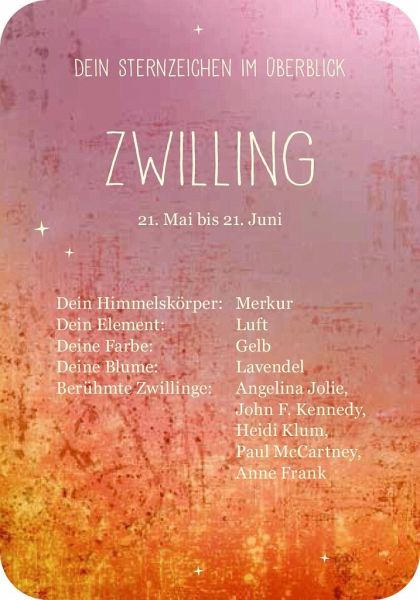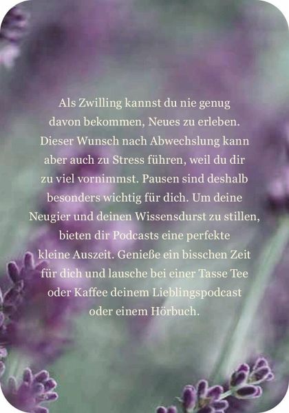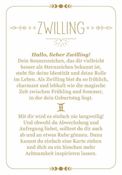 Die Magie deines Sternzeichens: Dein Element, dein Planet, dein Aszendent, deine Farbe und Vieles mehrWie Zwillinge innere Ruhe finden: Liebevoll zusammengestellte Zitate, Lebensweisheiten und Mantras, speziell für dein SonnenzeichenAstrologie für den Alltag: Besonders geeignete Entspannungsübungen, Rezepte und Ideen für dein SternbildSchönes Design für die Handtasche:_50 stimmungsvoll gestaltete Inspirationen für jeden TagHochwertige Verpackung: In der hübschen Box sind die Karten gut verstaut und begleiten dich überallhin