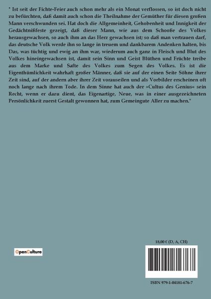 " Ist seit der Fichte-Feier auch schon mehr als ein Monat verflossen, so ist doch nicht zu befürchten, daß damit auch schon die Theilnahme der Gemüther für diesen großen Mann verschwunden sei. Hat doch die Allgemeinheit, Gehobenheit und Innigkeit der Gedächtnißfeste gezeigt, daß dieser Mann, wie aus dem Schooße des Volkes herausgewachsen, so auch ihm an das Herz gewachsen ist; so daß man vertrauen darf, das deutsche Volk werde ihn so lange in treuem und dankbarem Andenken halten, bis Das, was tüchtig und ewig an ihm war, wiederum auch ganz in Fleisch und Blut des Volkes hineingewachsen ist, damit sein Sinn und Geist Blüthen und Früchte treibe aus dem Marke und Safte des Volkes zum Segen des Volkes. Es ist die Eigenthümlichkeit wahrhaft großer Männer, daß sie auf der einen Seite Söhne ihrer Zeit sind, auf der andern aber ihrer Zeit vorauseilen und als Vorbilder erscheinen oft noch lange nach ihrem Tode. In dem Sinne hat auch der »Cultus des Genius« sein Recht, wenn er dazu dient, das Eigenartige, Neue, was in einer ausgezeichneten Persönlichkeit zuerst Gestalt gewonnen hat, zum Gemeingute Aller zu machen."