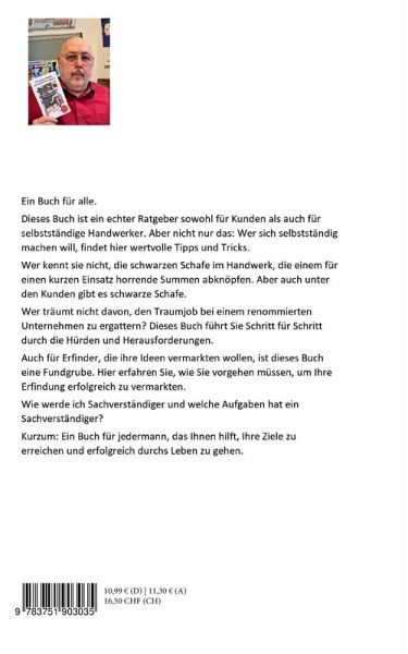 Ein Buch für alle.Dieses Buch ist ein echter Ratgeber sowohl für Kunden als auch für selbstständige Handwerker. Aber nicht nur das: Wer sich selbstständig machen will, findet hier wertvolle Tipps und Tricks.Wer kennt sie nicht, die schwarzen Schafe im Handwerk, die einem für einen kurzen Einsatz horrende Summen abknöpfen. Aber auch unter den Kunden gibt es schwarze Schafe.Wer träumt nicht davon, den Traumjob bei einem renommierten Unternehmen zu ergattern? Dieses Buch führt Sie Schritt für Schritt durch die Hürden und Herausforderungen.Auch für Erfinder, die ihre Ideen vermarkten wollen, ist dieses Buch eine Fundgrube. Hier erfahren Sie, wie Sie vorgehen müssen, um Ihre Erfindung erfolgreich zu vermarkten.Wie werde ich Sachverständiger und welche Aufgaben hat ein Sachverständiger?Kurzum: Ein Buch für jedermann, das Ihnen hilft, Ihre Ziele zu erreichen und erfolgreich durchs Leben zu gehen.